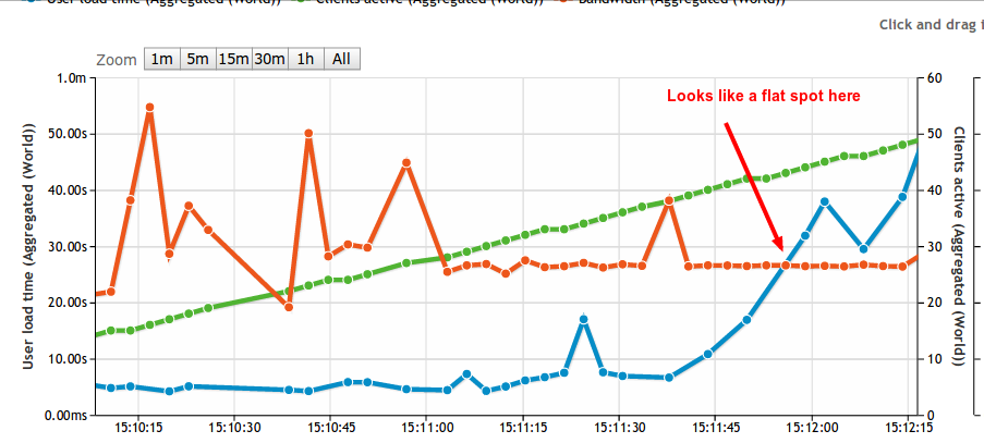 A comment on the response times (blue line) going down. At a high enough load, nearly 100% of all responses are error messages. Typically, the error happens early in the request and no real work is carried out on the server. So don’t be fooled by falling response times as we add load, it just means that the server is quick to generate an error.